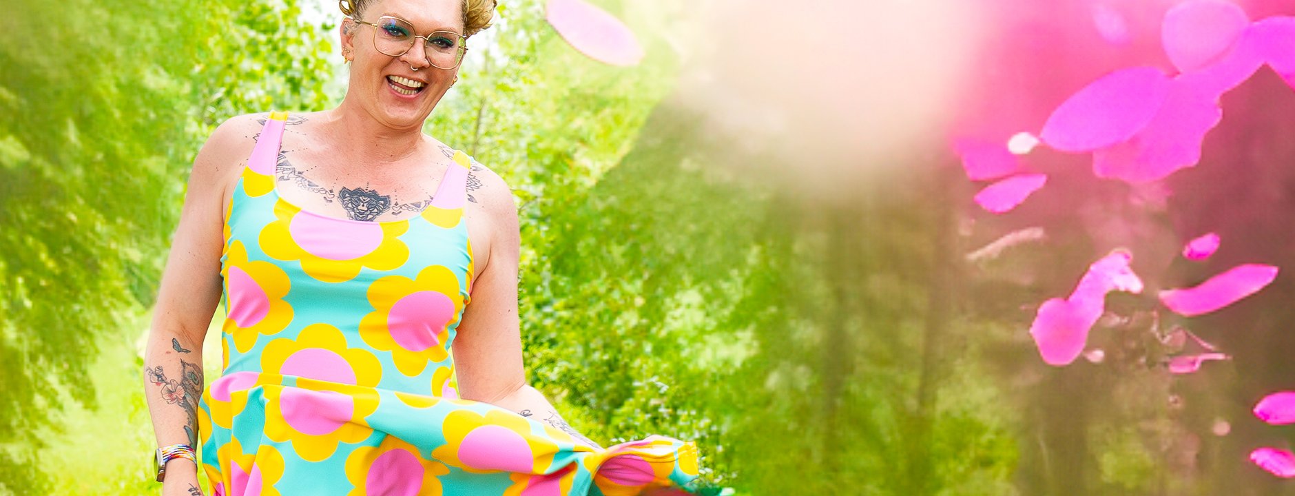 Woman in a colorful midi dress by SHALMIAK. Design: ELLIE LOVE yellow pink.